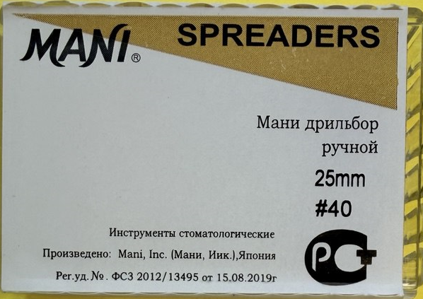 Mani Spreaders - ручной стоматологический эндодонтический инструмент с рабочей частью в форме гладкого усечённого стержня с конусообразным концом.
